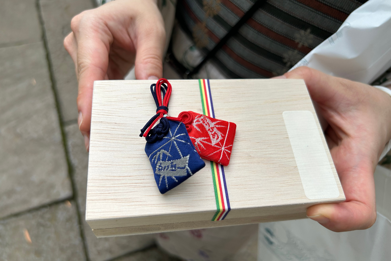 社殿から退出すると、お守りとお供物がいただけます。まず、お守りは、織姫と彦星をイメージした、赤と青のお守りがペアになった星合ひ守。の日しかいただけないお守りで、もちろんステキです!そして、先ほど奉納したお針箱や、お供物の雑穀(実際に食べられます、ありがたい~)など。お土産がたくさんあって、こちらもうれしい!