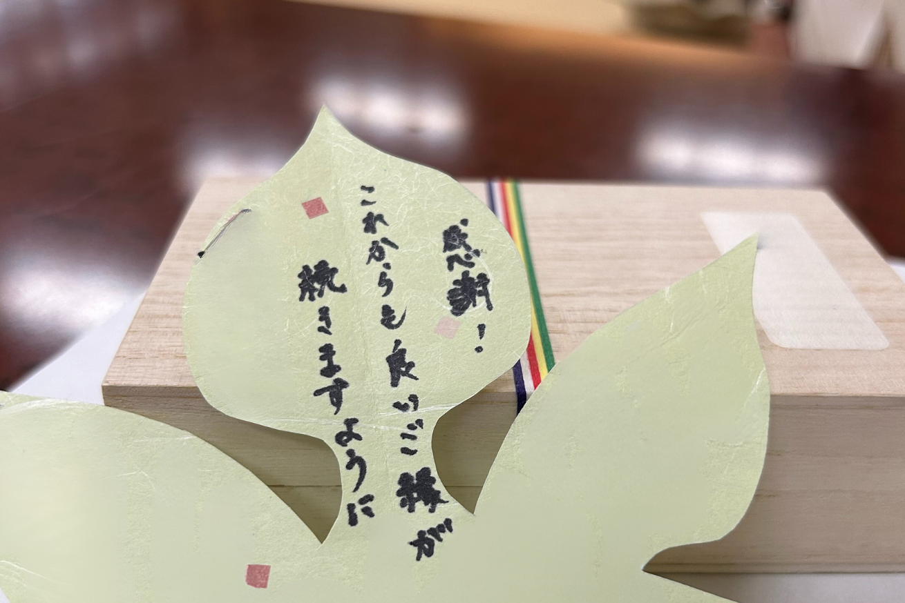 まず、梶の葉に、願いごとを記します。これは、平安時代に貴族たちが、「梶の葉」を「船の舵」に見立てて和歌や願い事を書いた七夕の風習に由来しているそうです。そして、乞巧奠にちなみ、お針箱に名前を書いて、ご神前にお供えしてくれます。