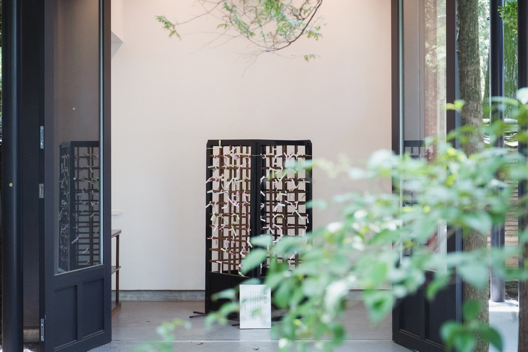 その昔、日本には願いをしたためた紙を社寺の格子に結って、縁結びを願う風習があったそうです。「縁結ひ(えんゆい)」に使われている、「縁結びの格子」は、なんと赤坂氷川神社の社殿で使われていたもの。多くのご縁を見守ってきたありがたい格子に願いを託すことができますよ。和紙は季節によって色のご用意が変わるそうです。