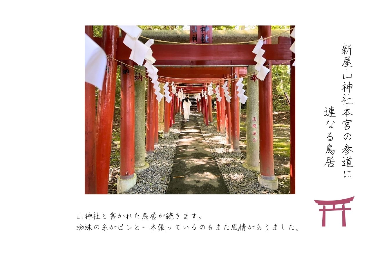本宮に向かう鳥居のスタート地点に立つと、鳥居に大きく「山神社」と書かれています。なんでも、「新屋山神社」とは、「新屋」地区の「山神社」という意味なのだそうです。「山神社」とは、「山の神」を祀る、全国に3,000社ほどあると言われる比較的小規模な神社とのこと。
