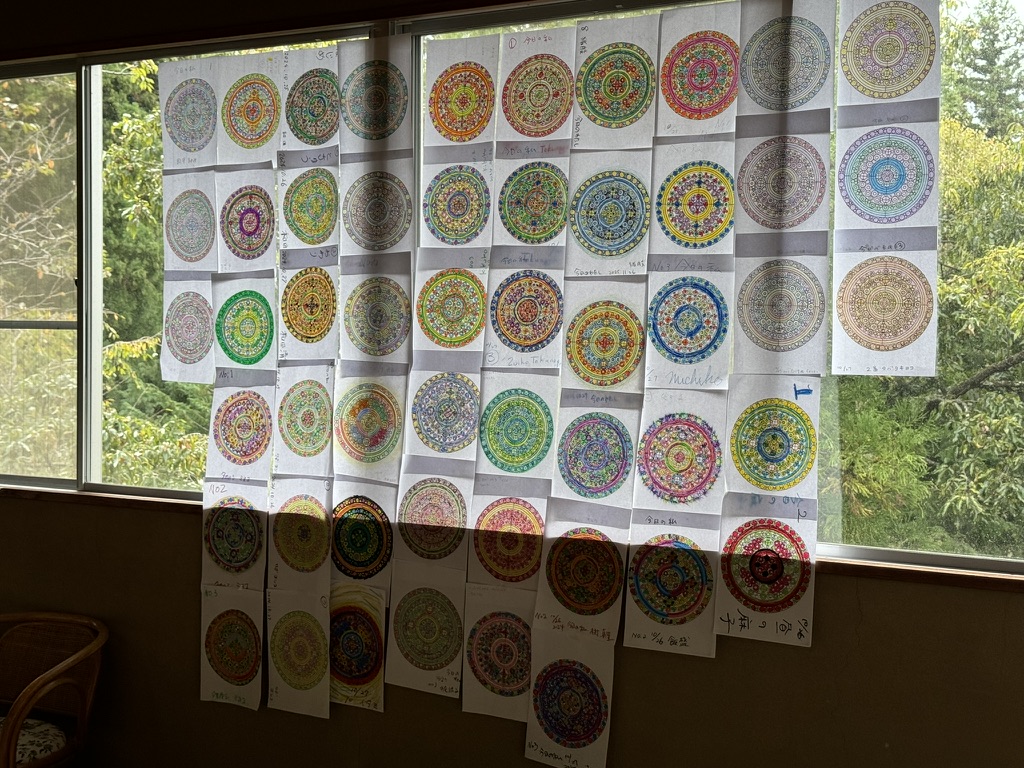 最終日に、完成した3つの曼荼羅を並べて飾りました。面白いことに、どれ一つとして同じものはありません。それはまるで、セラピストの先生方と参加者一人一人が作り出す「断食道場」という小さな世界を表しているよう。