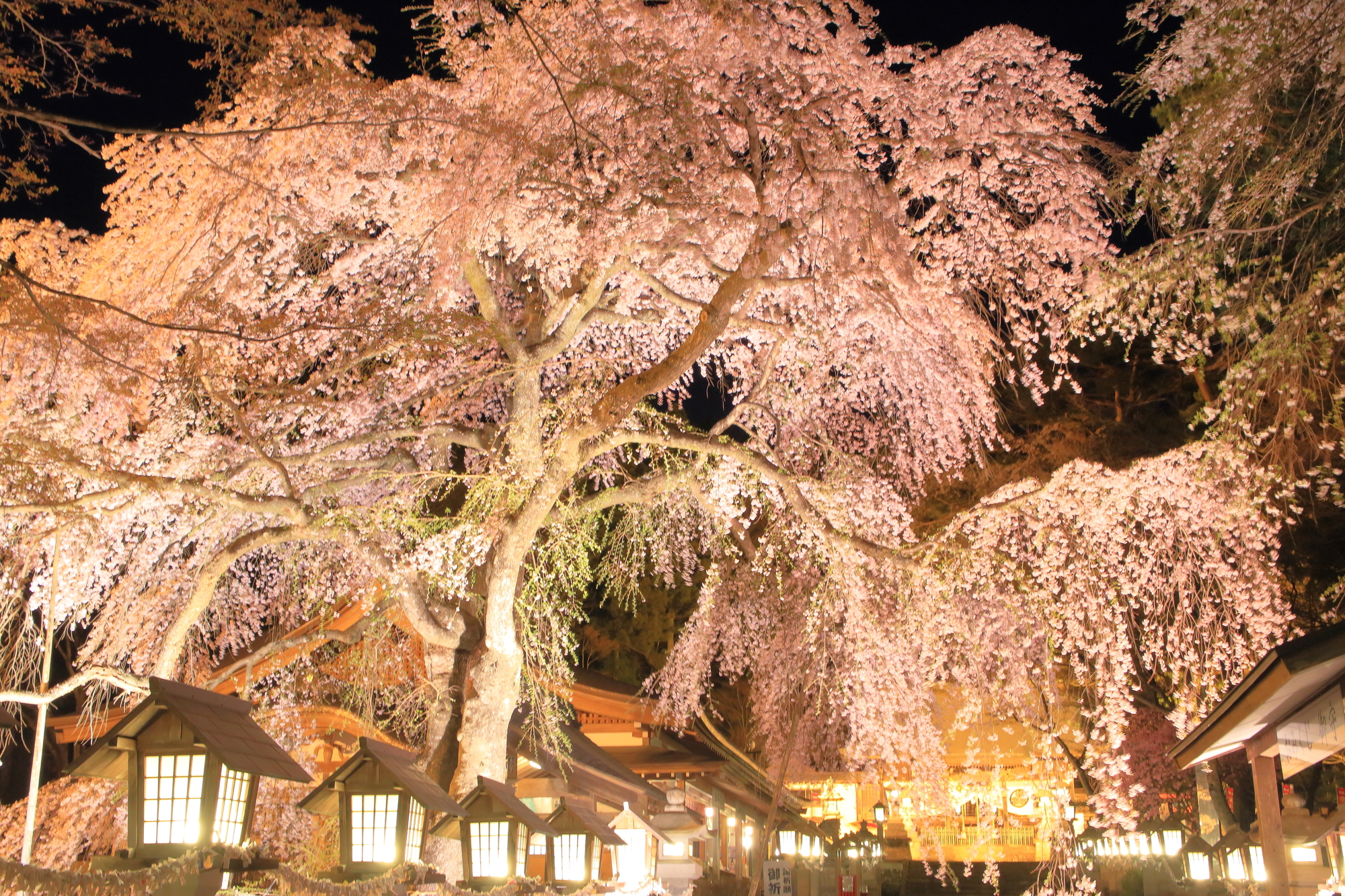 ご神木の「楽翁桜」は、別名「縁結びの桜」とも呼ばれ、この桜の下で恋愛祈願をすると願いが叶うと言われています。樹齢200年を超える紅しだれ桜で、春には空から降り注ぐような美しい花が咲き誇ります。夜にはライトアップされ、幻想的な雰囲気の中でお花見も楽しめます。