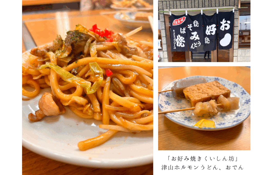 続いて、ランチのお話。津山地域は畜産が盛んだったそうで、焼き肉やホルモンのお店が多いそう。中でも“ホルモンうどん”というご当地グルメが気になったので、近くにある評判が良かったお店「お好み焼き くいしん坊」さんに伺ってみました。