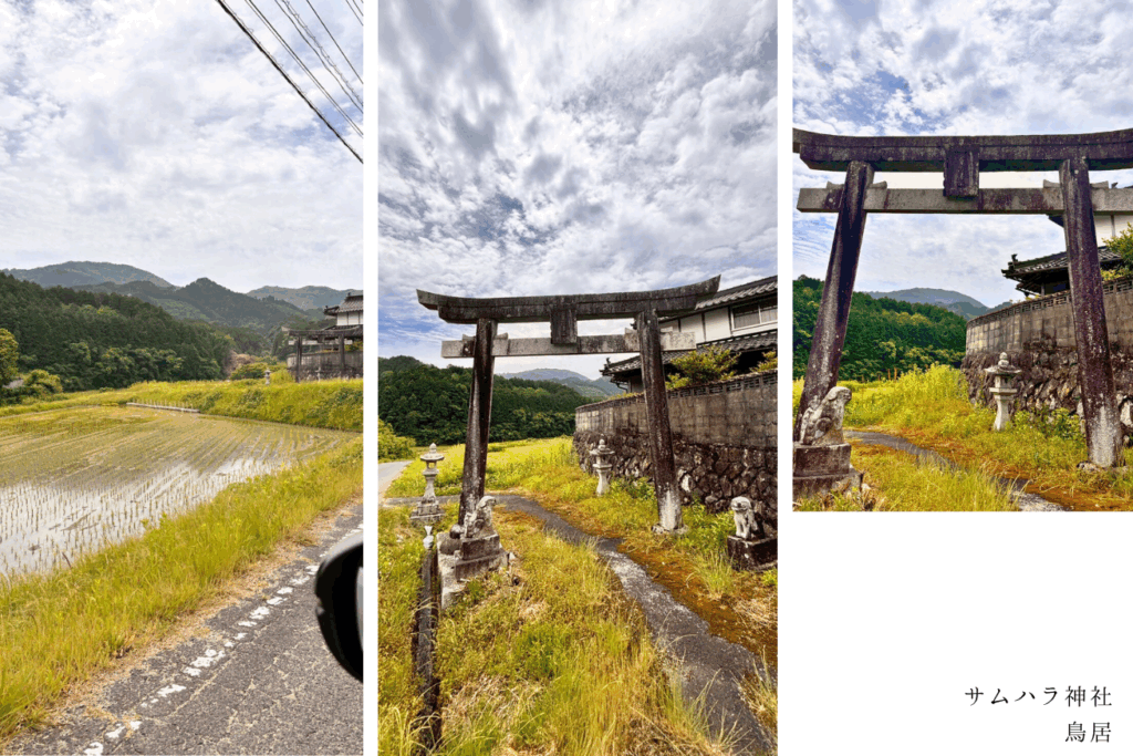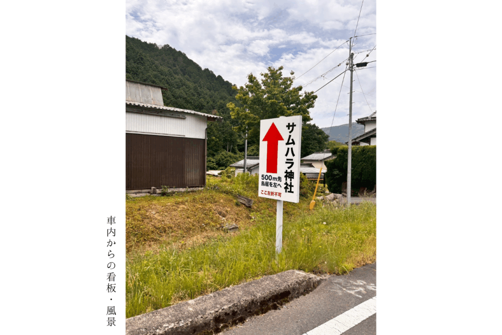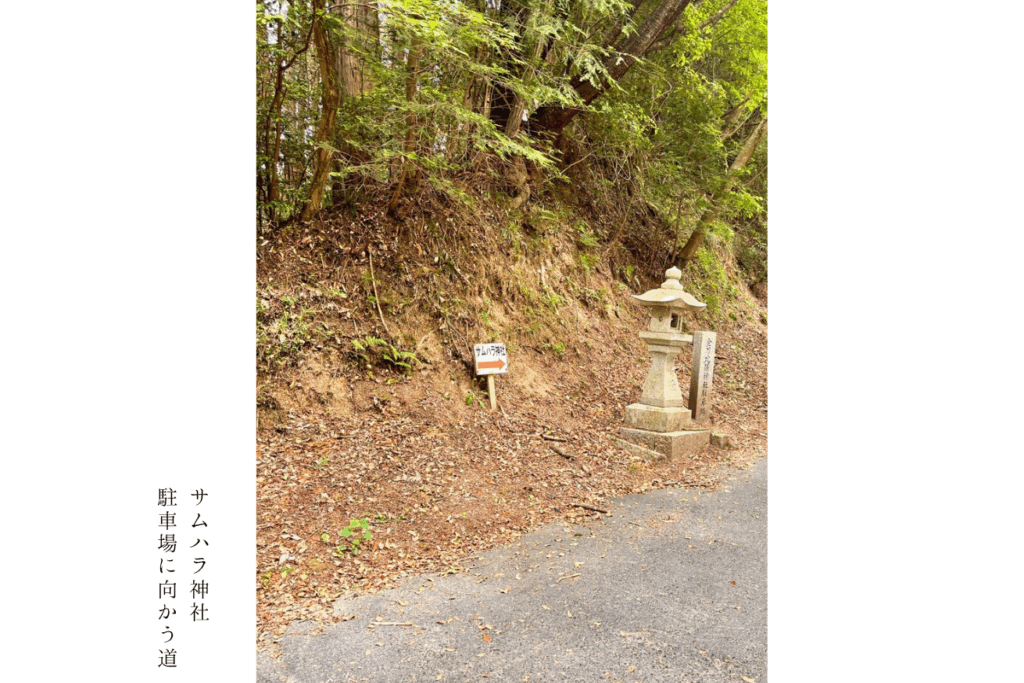 - 楢橋(※←“楢”が異体字。八の反対(\/)が正解。)という看板の場所に、サムハラ神社左折の看板があるので、左へ曲がる。道端の鳥居が目印(せっかくなのでくぐっていこう!)