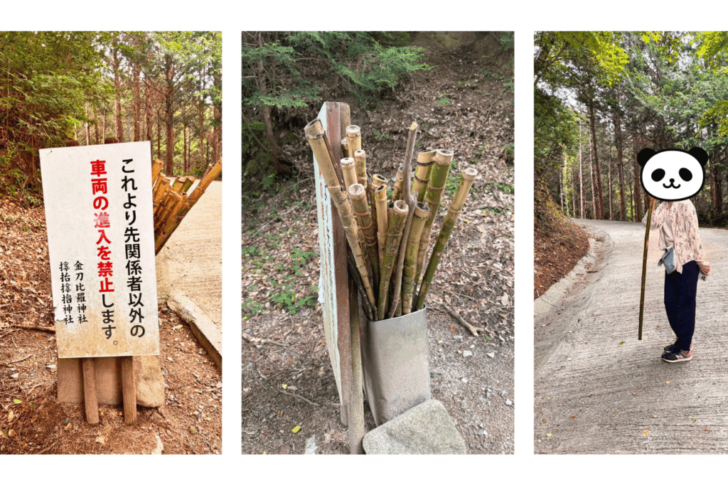 登山を覚悟していましたが、参道は緩やかな坂が続く程度。お借りした杖があったので、かなり楽でした。途中、会った方にご挨拶しながらお話を聞いたりしていると、あっという間に山道の左手にある、サムハラ神社の奥之宮に到着。想像以上に近かった!