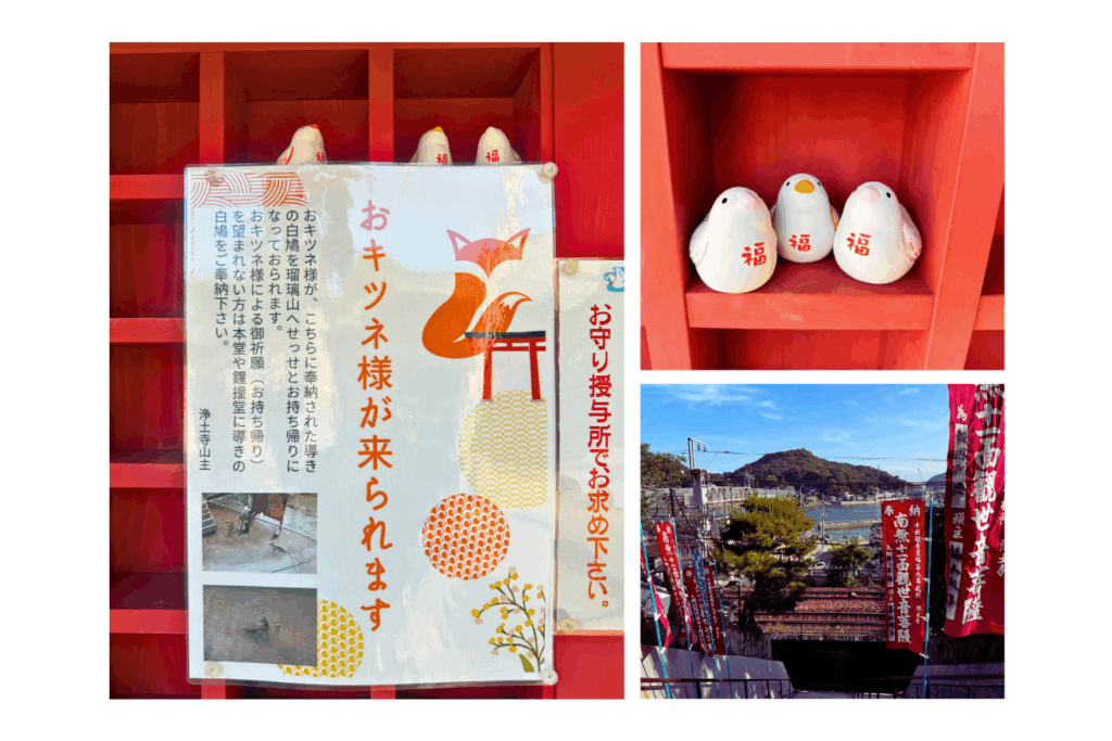 足利尊氏が船で京に攻め上る途中、白鳩が浄土寺に導いてくれたという伝説から、浄土寺さんには鳩のモチーフをしたおみくじやお守りがあります。