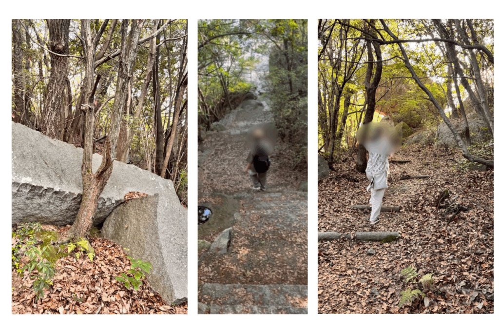 唯一あるのは、修験に使われていたという下りの道のみ。山道で、すでに体力も残り少なく、テンションも下がってきたのであきらめたいと思った筆者だったのですが、「せっかく来たのだからやっぱり天空の鳥居に行こう!」という残りのメンバーたち。確かに、ここまで進んだのだから、行こう!と思ったことを、下り始めて数秒で後悔しました…うん、これ、登山だよね。