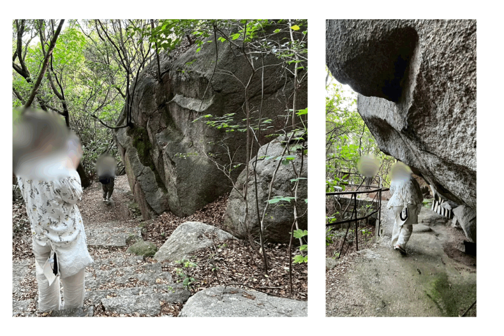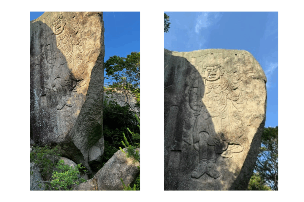 息を弾ませながらどんどん下っていくと、山の八合目あたりにあるという不動岩に到着しました。その名の通り、不動明王が刻まれた岩です。