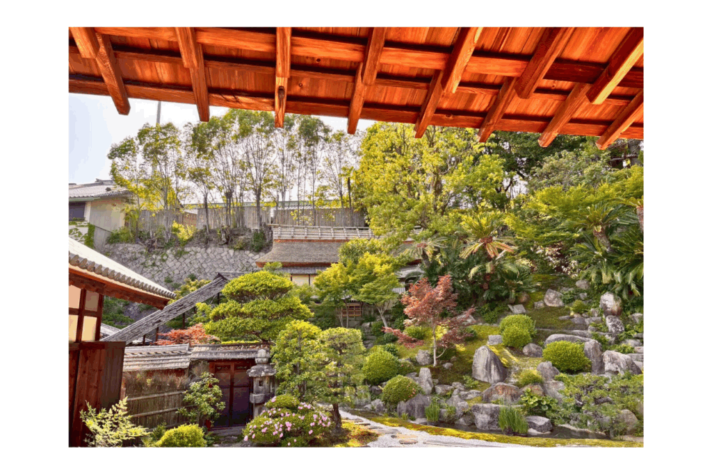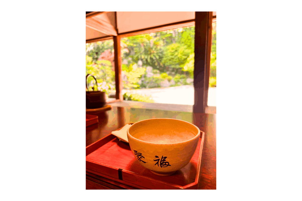 お守りも完成して大満喫したあと、最後は自分で点てるお抹茶をいただくという体験まで待っていました。竈で沸かしたお湯を入れていただき、しゃかしゃかと茶筅でお茶を点てる。そして、お菓子をいただいて、ズズズ、とお茶をいただく。ふと見上げた先には、重文の茶室を要する名勝の庭園が…あれ、最高すぎませんか?