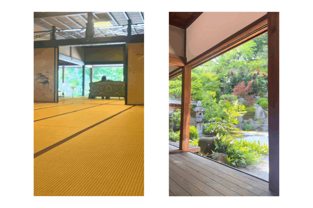 早速、中にお通しいただけたのですが、そこはまるで、別世界!畳敷のお部屋は福山藩の絵師だった方による襖絵に囲まれ、その中央にはレトロモダンなソファ。そして、縁側の先には、国が名勝に指定した枯山水のお庭が広がり、渡り廊下で本堂につながっています。語彙の少ない巡縁女子の口からは「うわぁ」「すごい…」という言葉しか出ませんでした。
