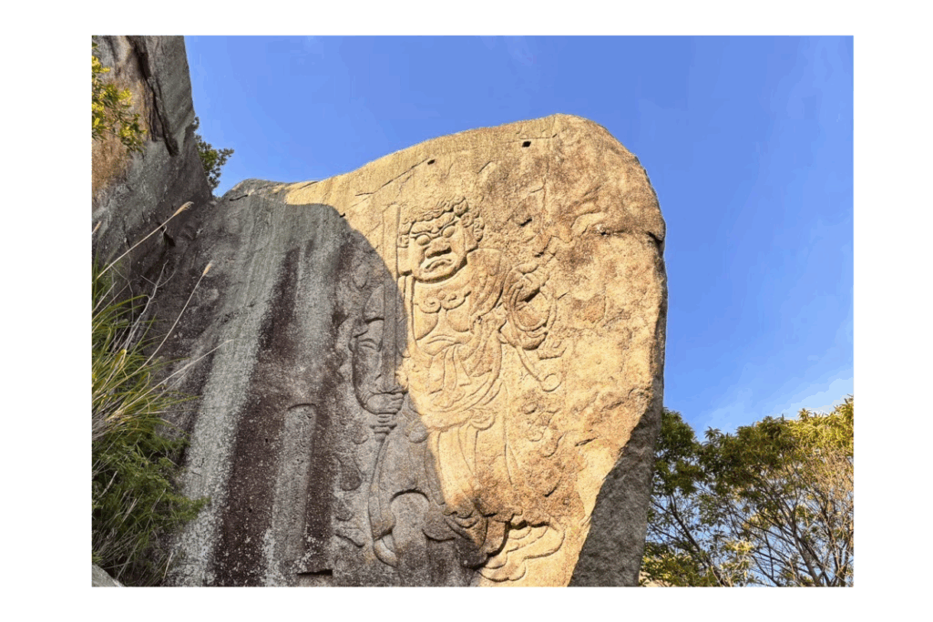 息を弾ませながらどんどん下っていくと、山の八合目あたりにあるという不動岩に到着しました。その名の通り、不動明王が刻まれた岩です。
