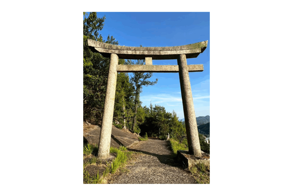 最後の力を振り絞って進みます。するとついに、天空の鳥居と対面!香川県の鳥居を想像していたので、鳥居の先に海が見えると思っていましたが、こちらは鳥居の先は、瀬戸内海に浮かぶ島の山でした。それでも、到着した時は本当に感動でした。