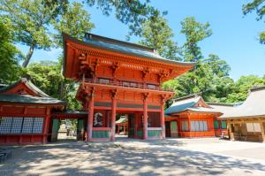 参道を進むと、朱色の立派な楼門が見えてきます。こちらは、阿蘇神社や筥崎宮と並び、日本三大楼門の一つとされています。さらに進むと、右手に拝殿が現れますが、その前に、左手にある小さなお社高房社を参拝しましょう。