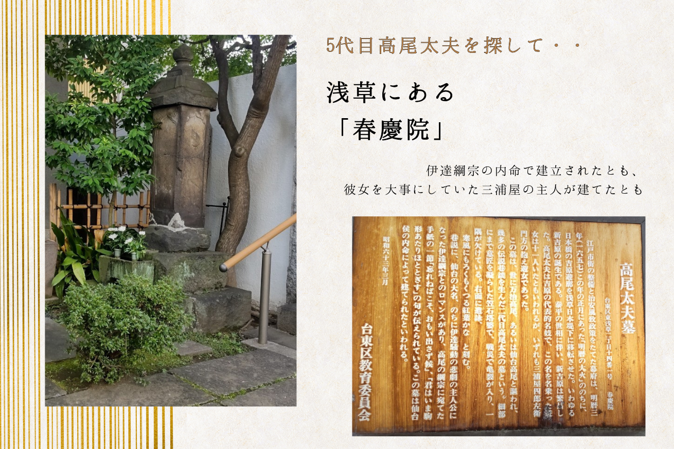そもそも2代目高尾太夫は湯治に訪れた三浦屋夫妻がその土地に居た少女に一目惚れし養女に貰い受けたのです。その後、明暦の大火で三浦屋が傾いた時、彼女自ら「家の再興のため遊女になる」と言い養父母の反対を押し切り太夫にまで上り詰めたのです。そんな大切な娘の為にお墓を建立したという説も有ります。