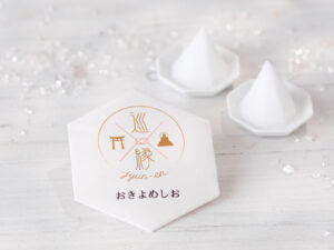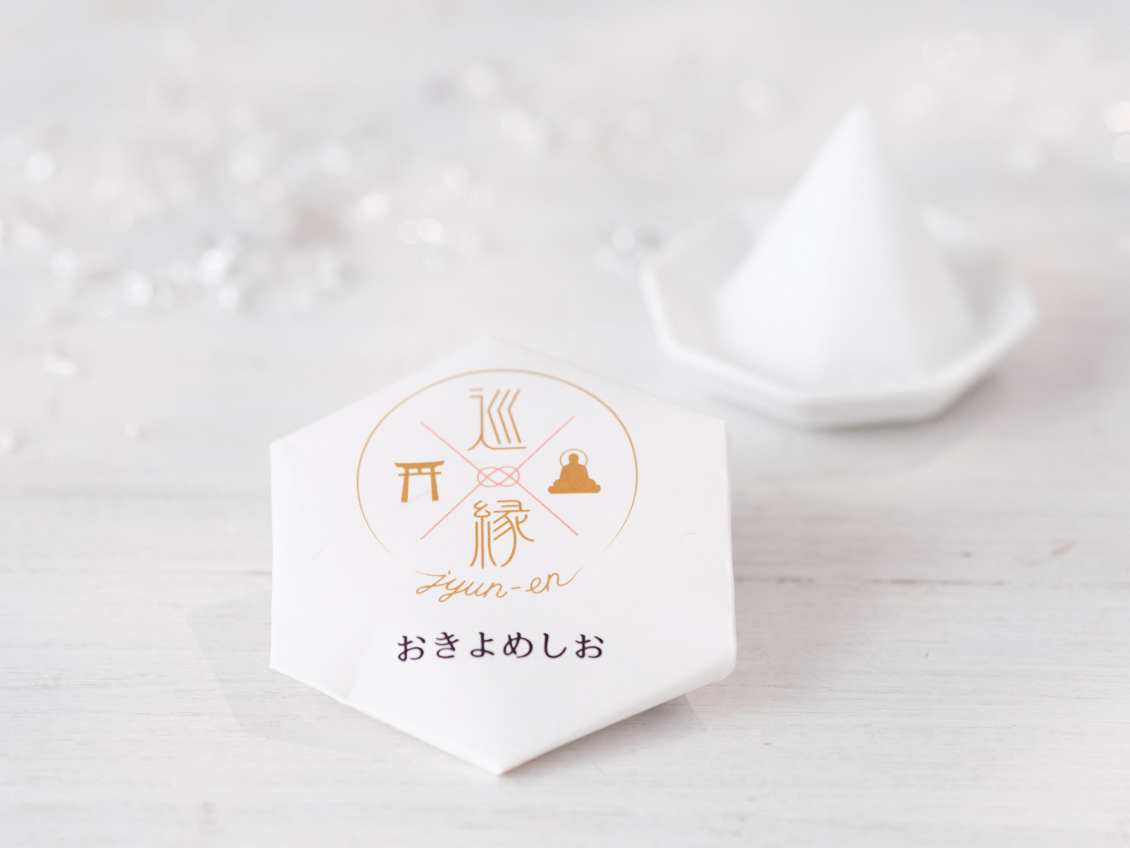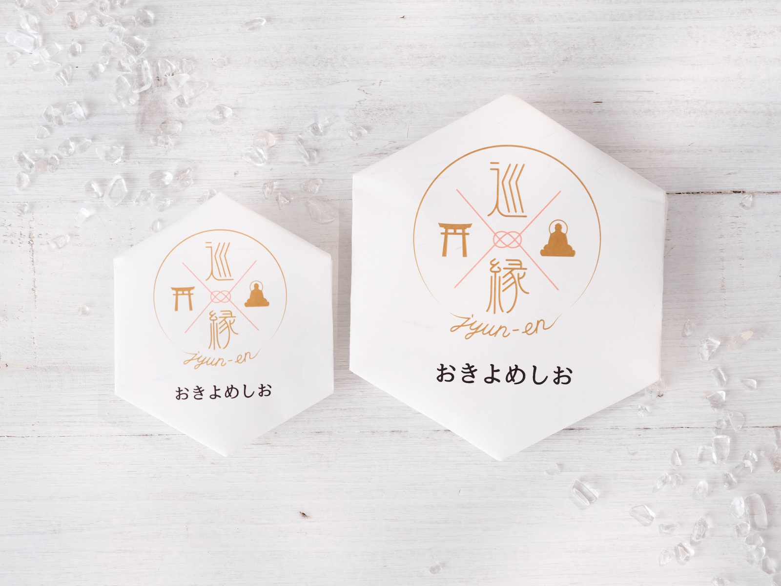 最近、SNSでも話題の塩を、巡縁オリジナルの縁起の良い六角形パッケージでご用意しました。