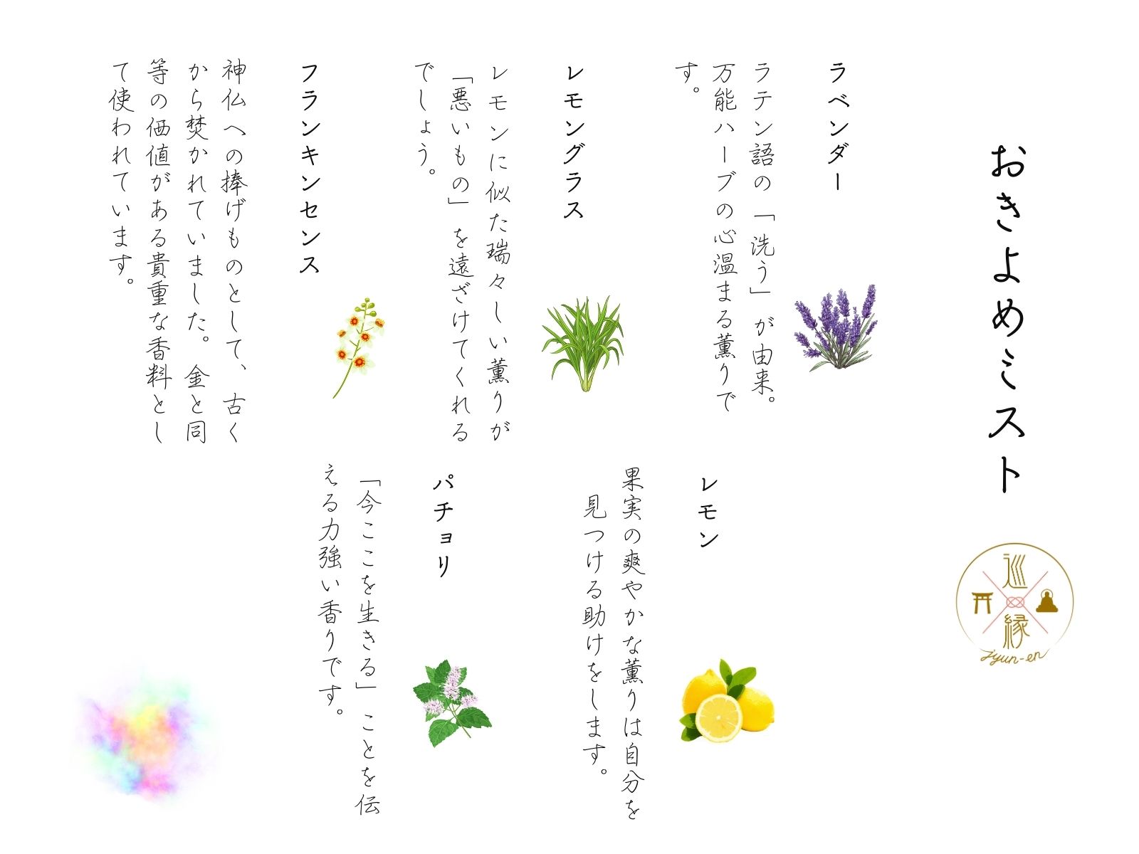 巡縁では、強力な厄除け効果を持つ天然アロマ100%と国産の天然あら塩を使った「おきよめミスト」を開発しました。