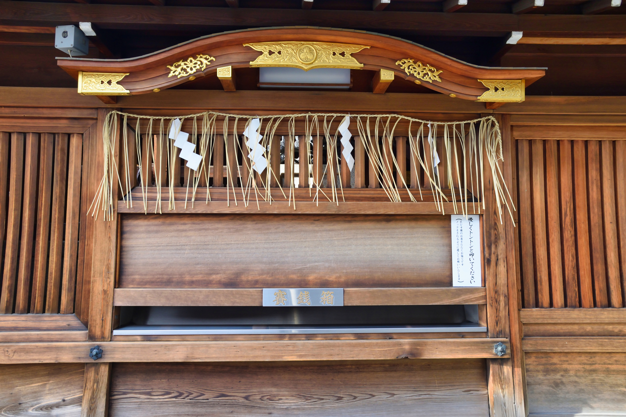 またまた、こちらの神社特有の風習がございます。本殿でのお参りを済ませましたら、みなさんそっと左奥に周り本殿の奥に向かいます。すると写真のこちらのお賽銭箱が現れます。